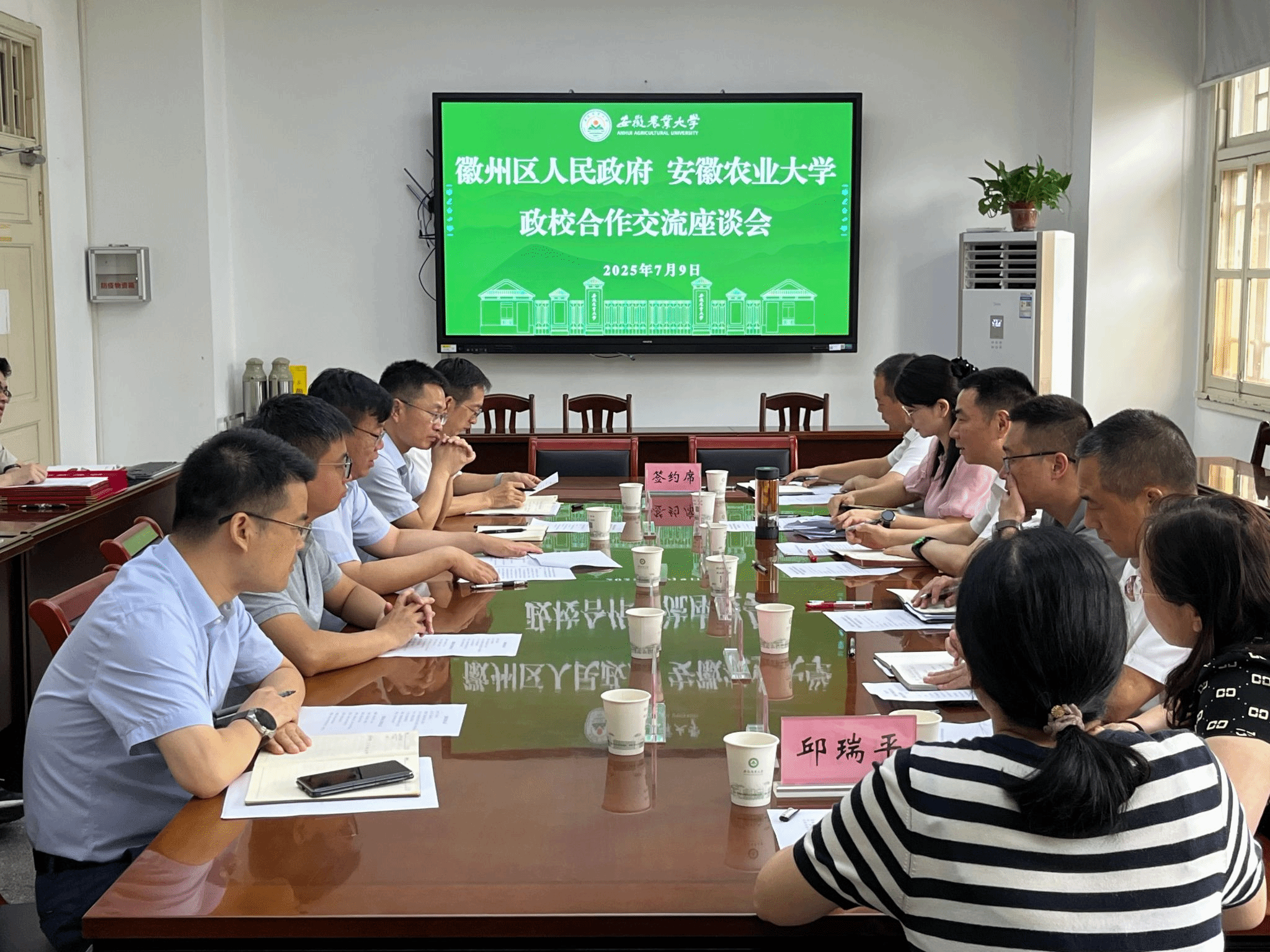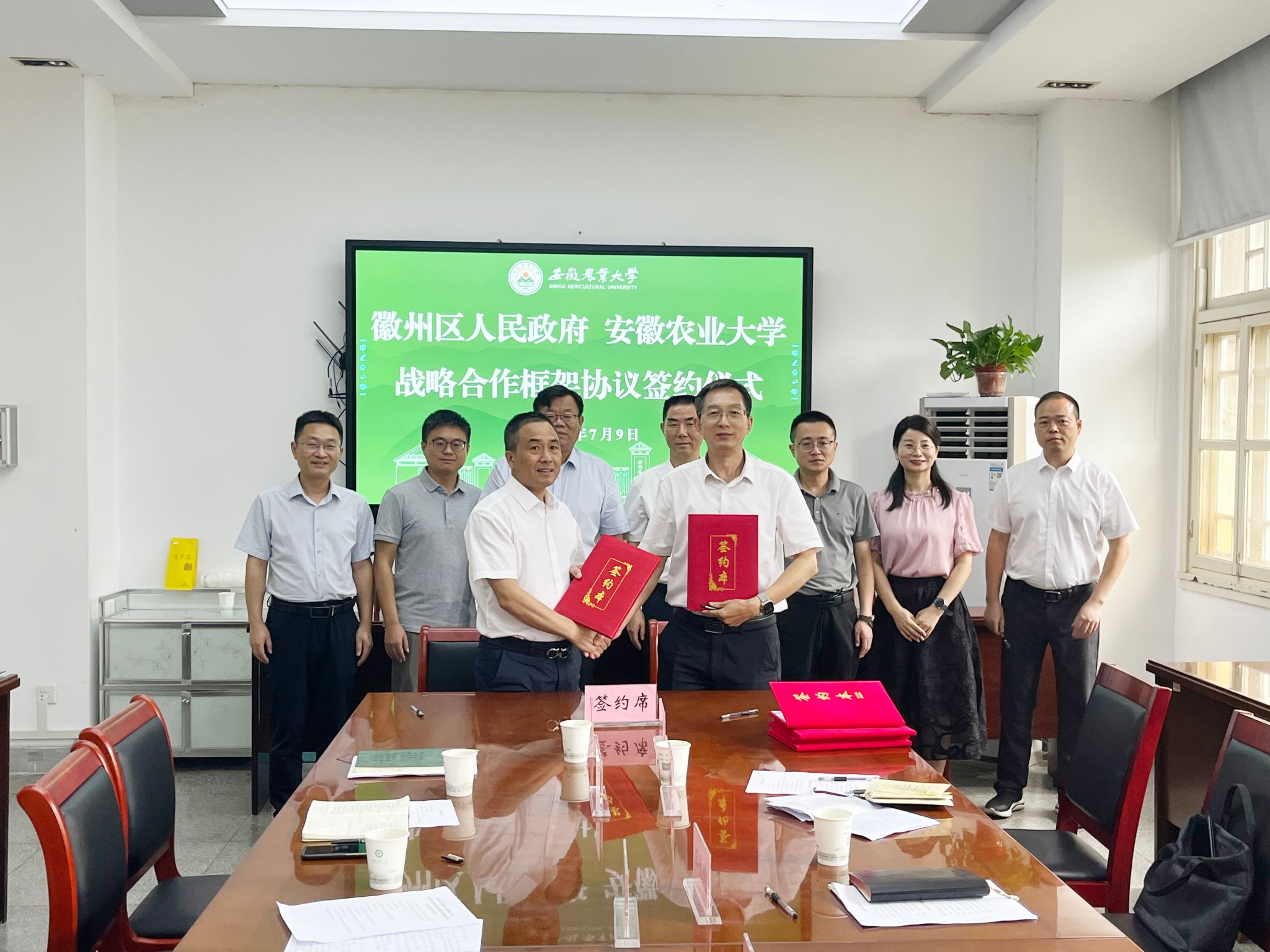 本网讯 7月9日,在校第一会议室举行学校与徽州区人民政府校地战略合作框架协议签约仪式。会前,公司党委副书记、董事长操海群接见了徽州区委书记汪长剑一行。公司党委常委、副董事长江海洋,徽州区委书记汪长剑、区委副书记张轶、副区长程丽群出席签约仪式,徽州区委组织部、经济技术开发区、科技工信局、农业农村局,校科技处、社会合作处、122cc太阳成集团等单位负责同志参加活动。