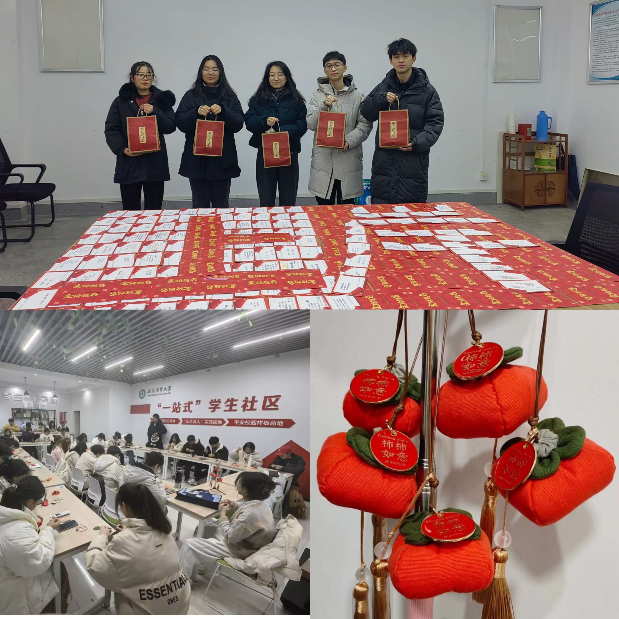 别样情谊,祝福连心。学院动员低年级员工组织开展“学弟学妹送祝福”活动,征集考研祝福卡、手工缝制香包,一笔一画写下的暖心鼓励,一针一线编织出“柿柿”如意,给学长学姐们带来无限力量,希望学长学姐们顺利上岸、一战成硕。