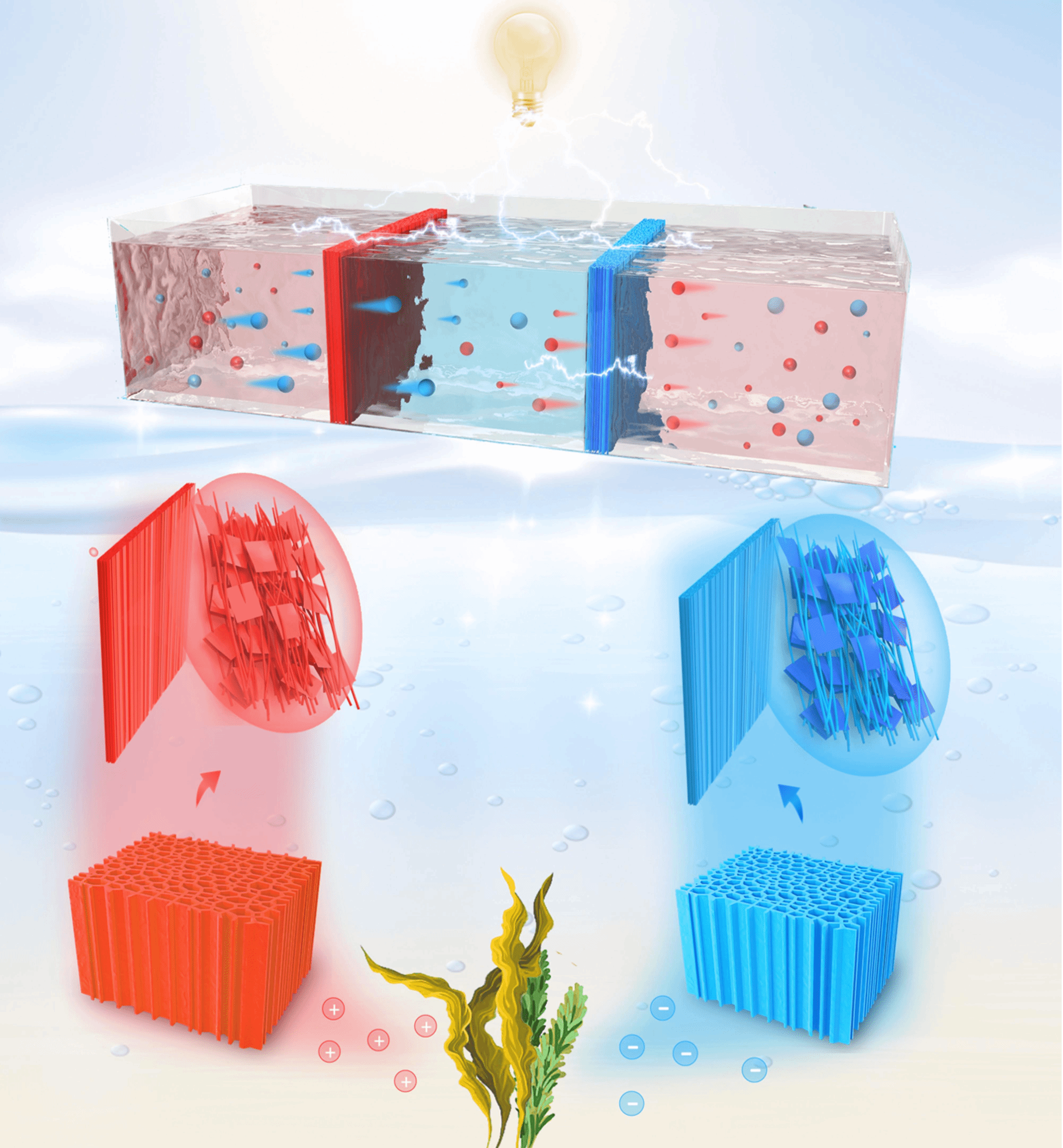 针对离子传输路径的优化设计可显著提高带电纳米通道的离子传输能力并实现高性能渗透能量收集的有效途径。 该研究团队通过对藻类纤维素纳米纤维和MXene纳米片进行化学修饰、冷冻铸造和结构致密化,制备带有相反电荷和取向纳米通道的纤维素/MXene气凝胶膜(简称气凝胶膜),显着提升膜在低盐浓度下的离子电导率(最大电导率为2.88× 10-3 S cm-1)。特别是,气凝胶膜的输出功率密度分别比抽滤和非取向气凝胶膜提高2.97和4.89倍,证明纳米结构控制对提升输出性能的必要性。 此外,由于MXene的光热效应,相反带电单元在模拟人工海水/河水条件及模拟阳光下实现8.87 W m-2的最大输出功率密度,并在持续运行168小时后仍保持高发电水平。作为概念验证,我们设计并串联九个相反电荷单元,成功输出1.85 V 电压并驱动电子计算器等工作。这项研究揭示具有取向纳米结构的可再生材料可实现高性能渗透能收集。本工作第一单位为122cc太阳成集团,通讯作者为公司叶冬冬教授,共同通讯作者为122cc太阳成集团焦晨璐副教授和合肥工业大学王慧庆副教授。(文图/叶冬冬 编辑/张飞 预审/许云辉 审核/汪钟凯)