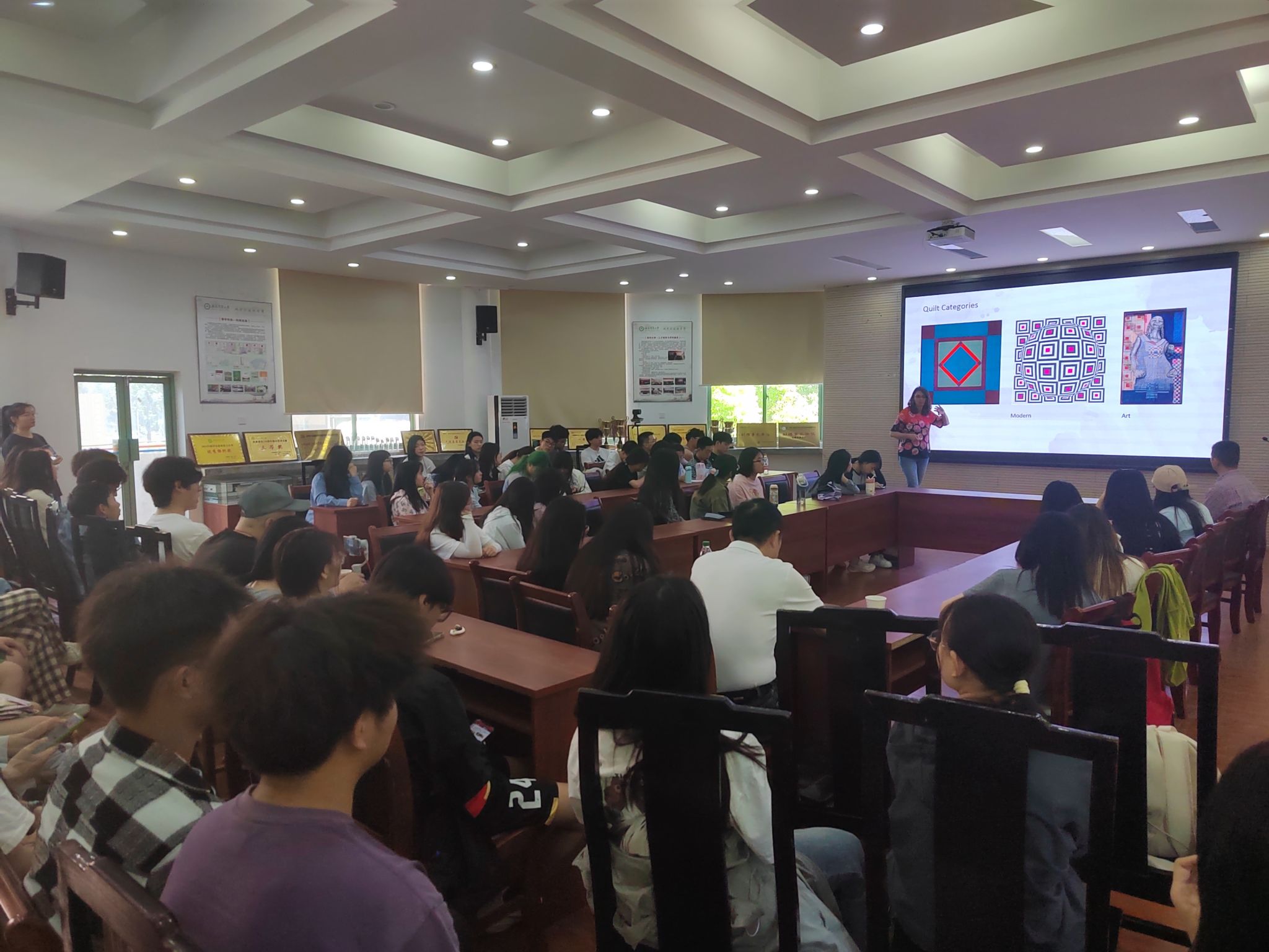 Barbara Lange从传统拼布、现代拼布与艺术拼布的演变介绍了国际拼布的发展与特点,然后从拼布工艺、材料、国际拼布比赛展览作品、以及Ai技术在现代拼布的应用等方面进行了介绍,为师生们分享了2023-2024年法国、英国和美国举办的国际拼布展览、流行趋势及其本人的拼布艺术作品,并号召同学们参加国际拼布比赛。