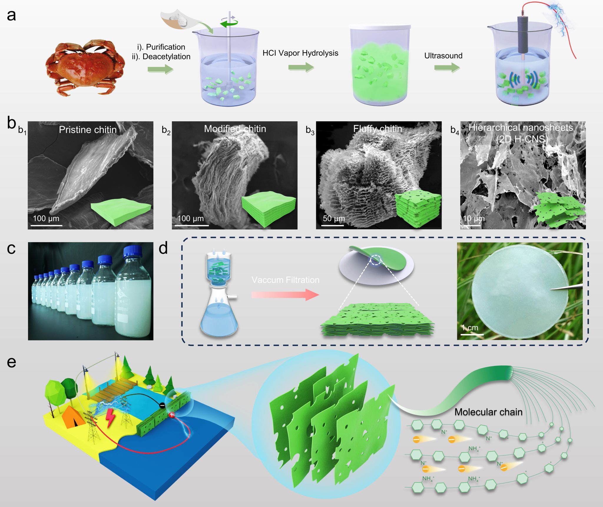 基于以上挑战,叶冬冬教授团队报道了一种通过可控剥离甲壳素本征Bouligand结构进而得到的一种新型2D材料—二维多尺度结构甲壳素纳米片(2D H-CNS)。将其真空抽滤后组装的2D层状膜可用于高效渗透能收集。这项研究促进了具有高性能渗透能量采集的生物质材料的开发。这种新型二维纳米材料2D H-CNS的制备方法成本较低、绿色环保,因此在产业化生产及应用中表现出极大的潜力。