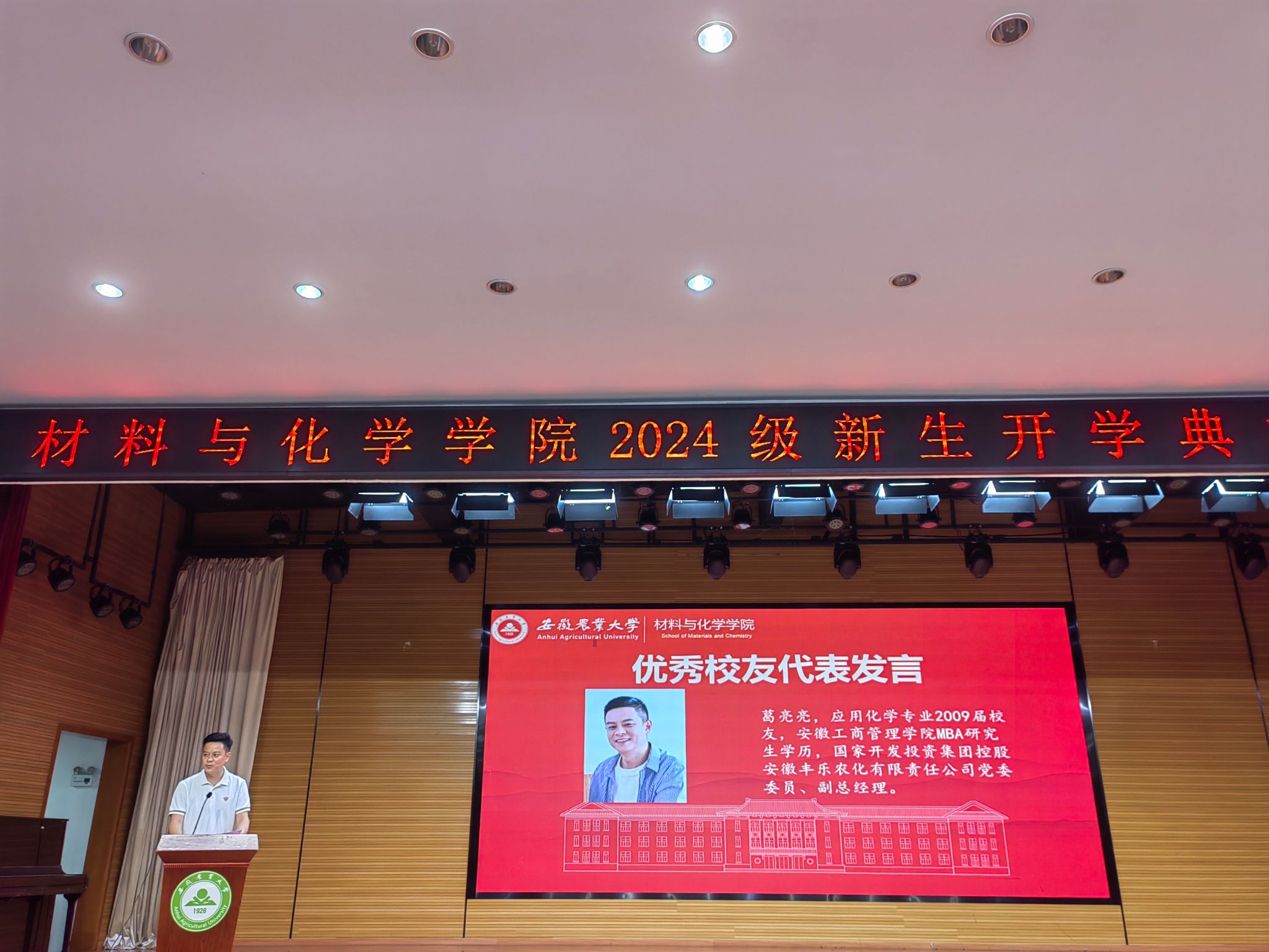 优秀员工2009届应用化学专业葛亮亮,在发言中回顾了自己的成长经历和在安农求学的历程,表达了对母校和老师们的感激之情,鼓励学弟学妹要有远大理想,不负盛世,志存高远,用奋斗书写精彩人生,用拼搏成就青春梦想。