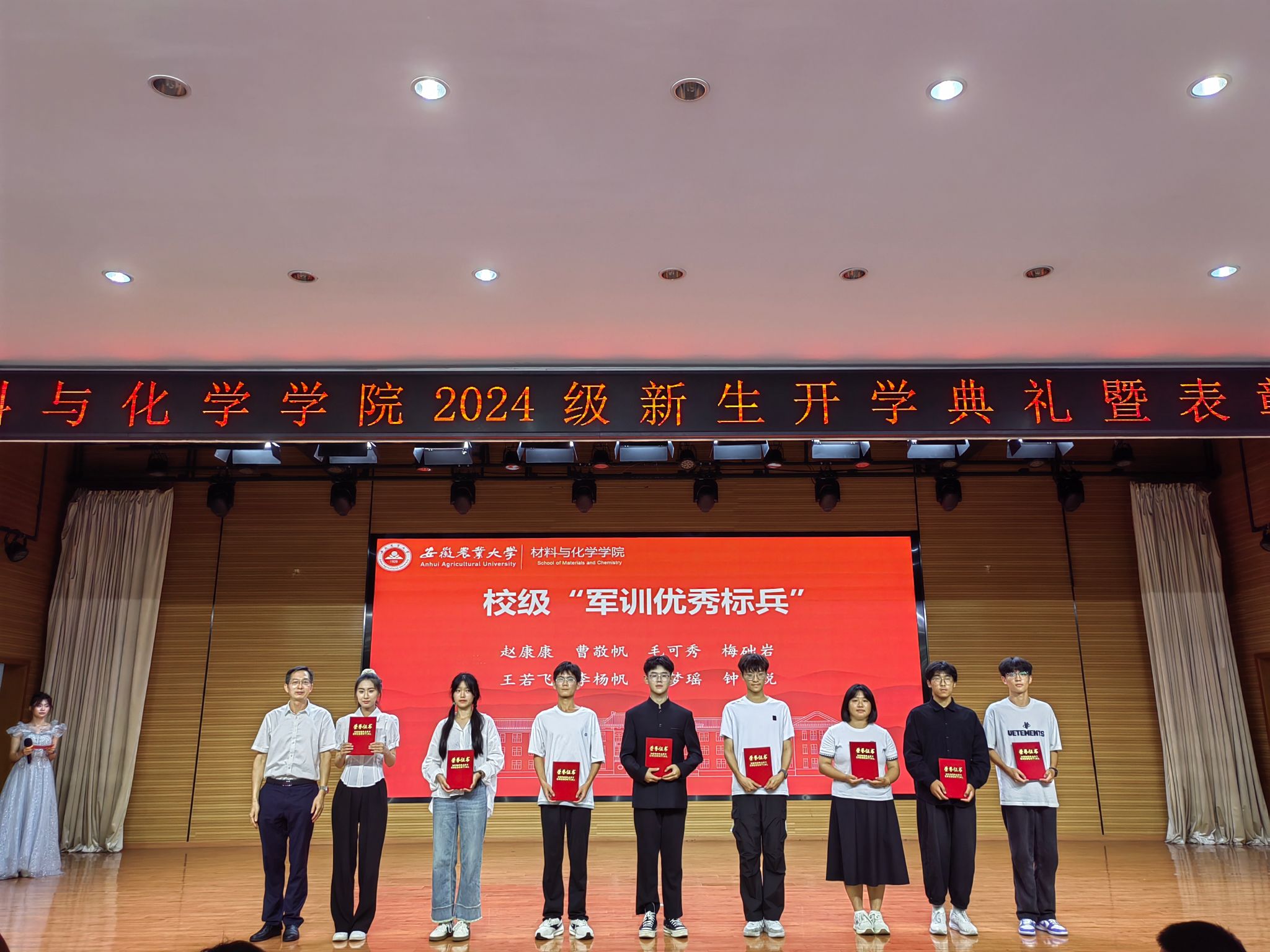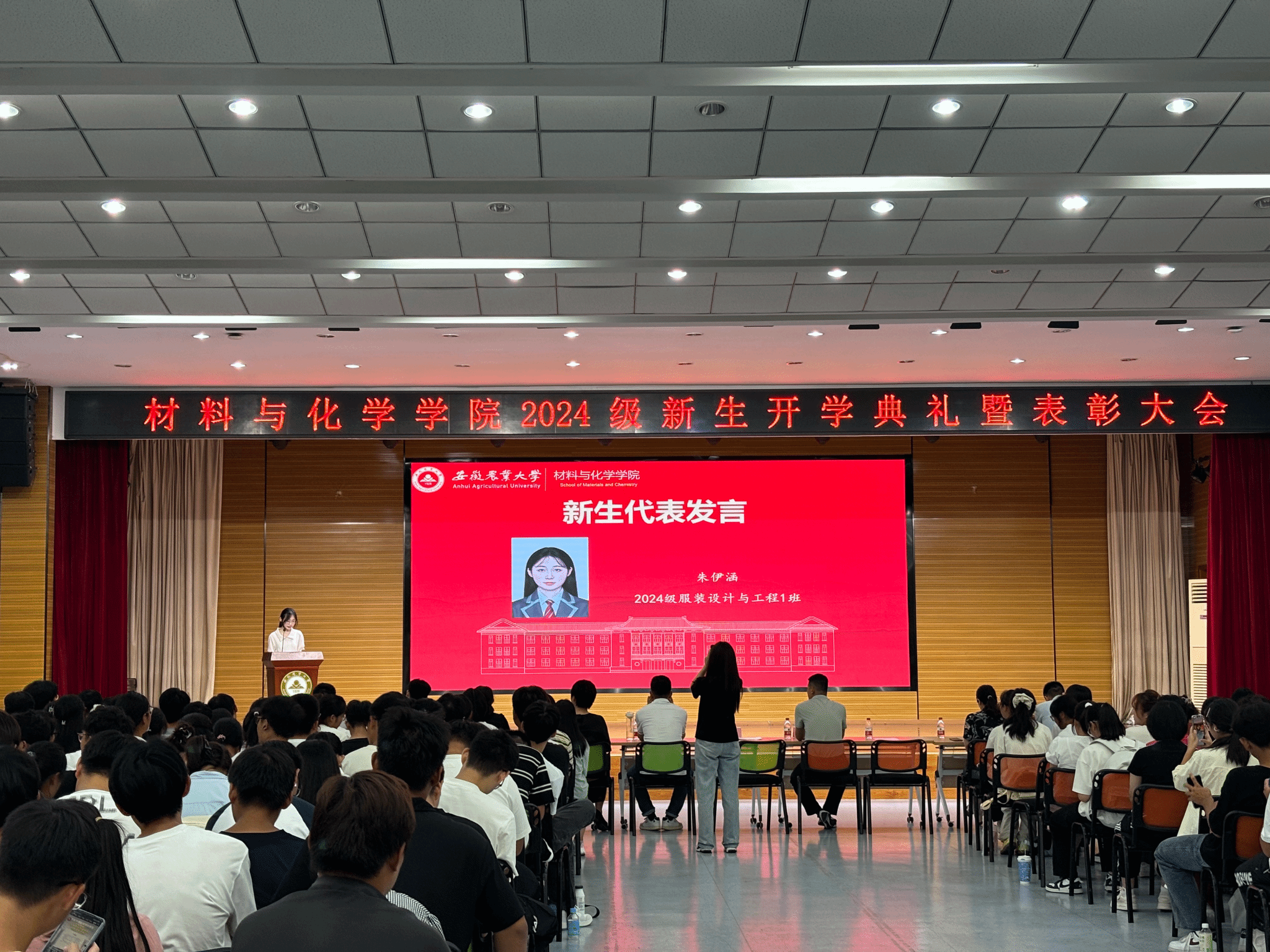 2024届应用化学专业王文英作为老生代表发言,结合自己本科学习,分享他的考研经历,并激励学弟学妹们,加强磨砺,增长本领,追逐梦想。新生代表2024级服装设计与工程专业朱伊涵发言表示,站在人生的崭新起点,成为“新材化人”,将脚踏实地,勤勉自强,做坚守奋斗的合格农大人,用心动脑,求实探索,做求知勉行的优秀农大人。