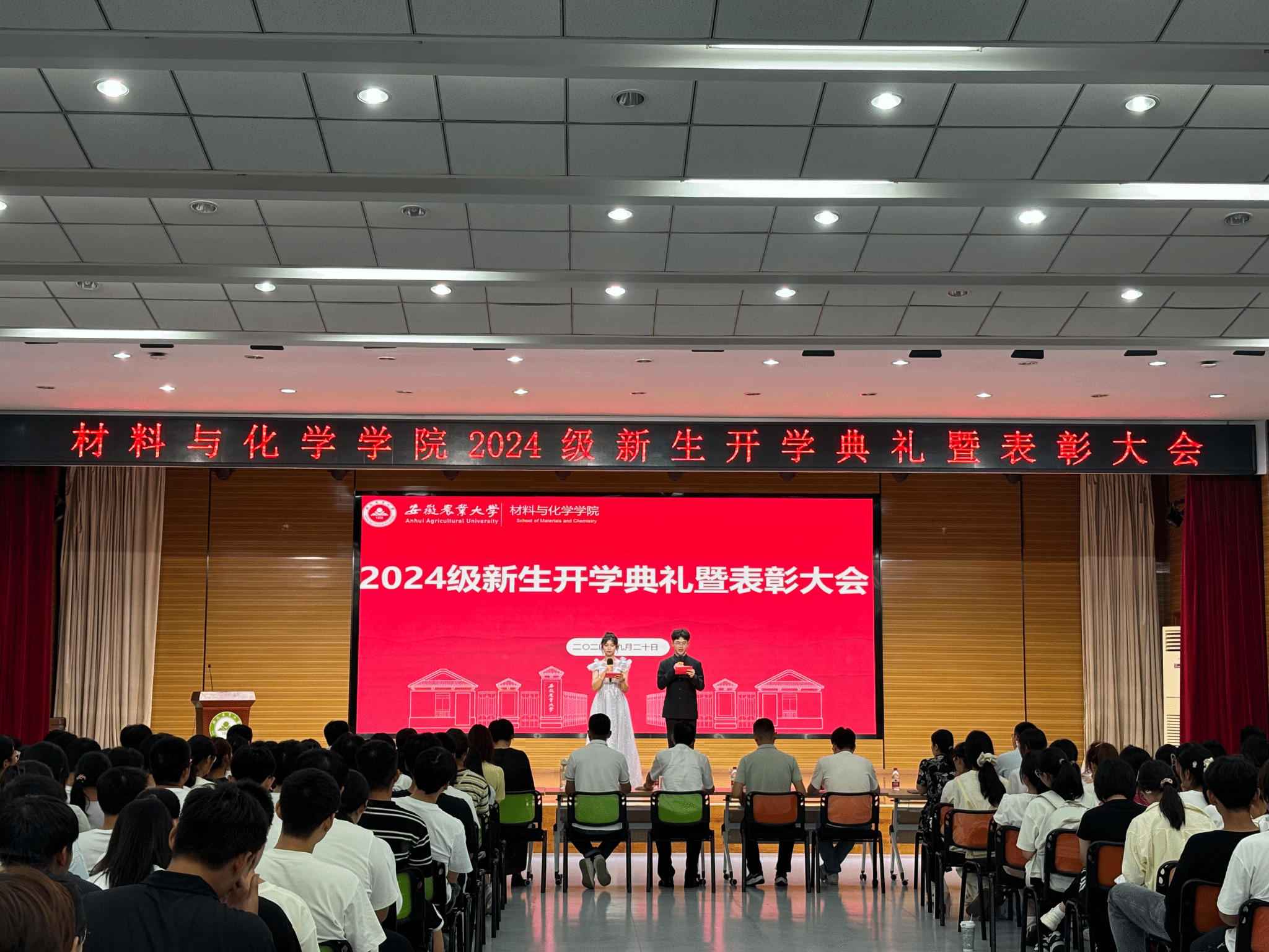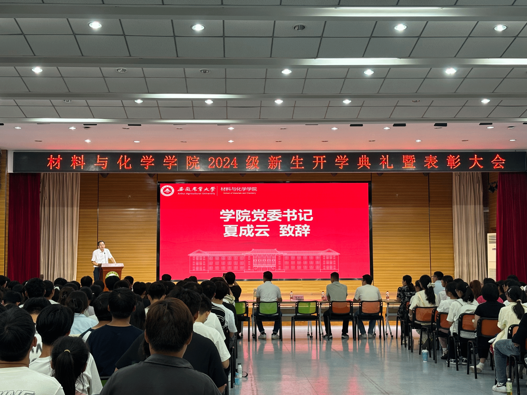 本网讯 9月20晚上,122cc太阳成集团2024级新生开学典礼暨表彰大会在欣苑四楼小礼堂隆重举行。588名本科生和研究生齐聚于此,公司党委书记夏成云,党委副书记、纪委书记周晓娟,副经理李乾坤,员工代表葛亮亮,以及各系主任、教师代表、全体新生辅导员、班主任出席典礼。