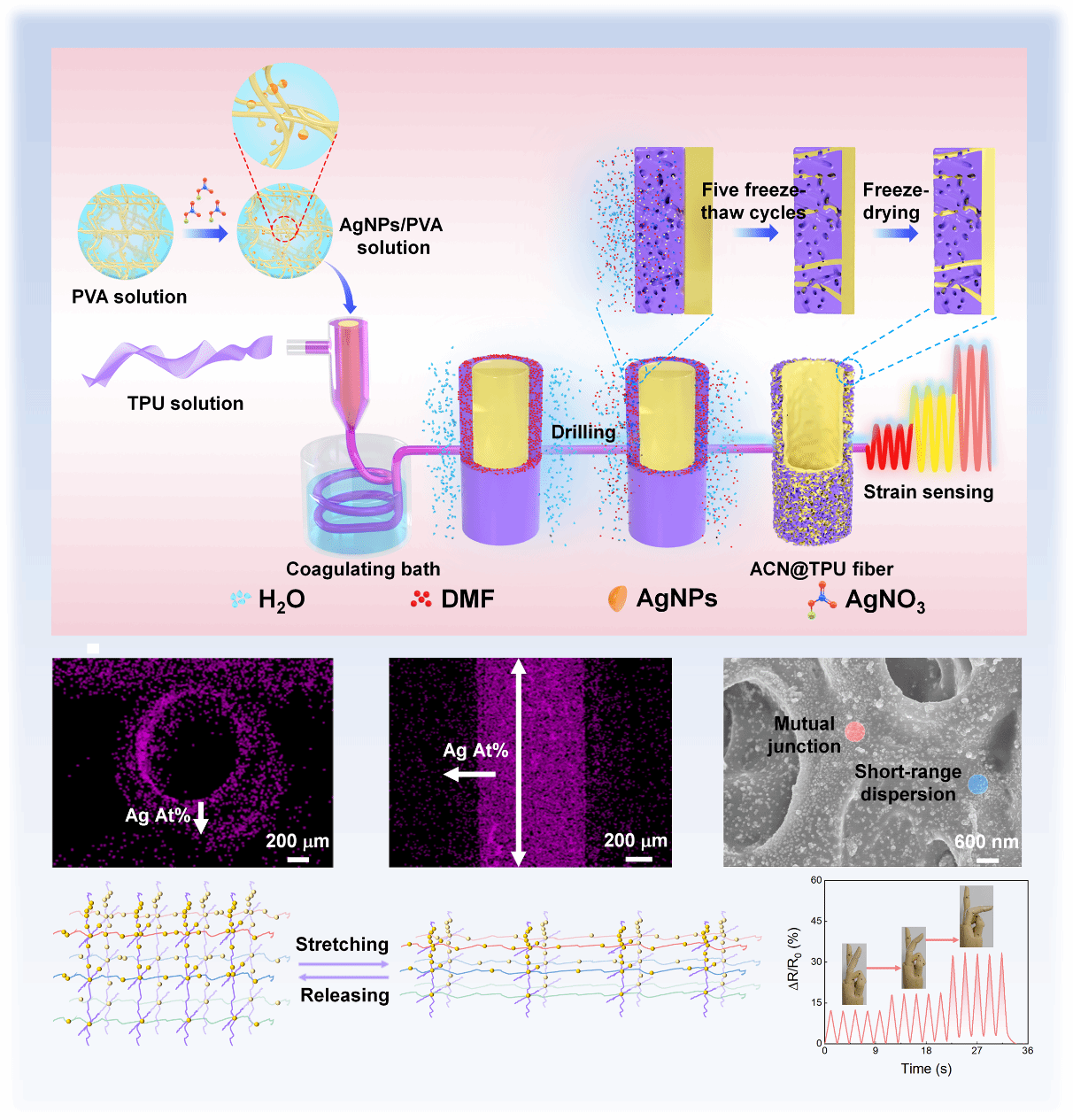 鉴于此,杜兆芳教授团队提出了冻干同轴纺丝新策略,构建了各向异性导电网络纤维。导电材料的含量沿纤维方向一致,垂直于纤维方向逐渐降低。在应变下,沿纤维方向的导电材料剧烈断裂,提供高灵敏度;垂直于纤维方向的导电材料相互接触实现良好线性度。这种纤维材料适用于高精度应变检测和健康监测等实际场景。该研究为制备高性能应变传感纤维提供了有益参考。