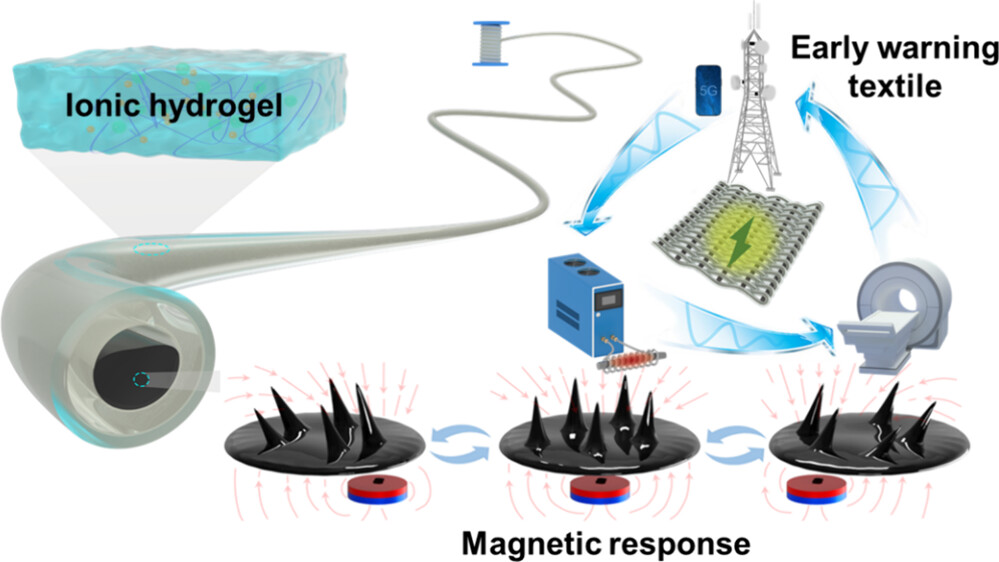 研究表明,电磁辐射对孕妇健康及胎儿发育具有重大影响,高强度磁场会破坏细胞组织的化学稳定性,诱发细胞凋亡、抑制胚胎生长,从而增加孕妇健康风险和胎儿畸形的概率。先进功能纤维团队突破传统技术的限制,开发了一款面向孕妇等弱势群体的自驱动磁流体纤维,通过软接触结构和磁流体核心的创新组合,使纤维在多种复杂环境(高温、高湿度)下具备出色的传感性能(0.13 s的响应速度和100 mV/Gs的灵敏度),同时还具有优异的柔韧性和延展性。结合蓝牙模块和近场通信功能,研究团队设计了一款集环境预警、健康监测与无线传输于一体的智能纺织品,开启了纤维电子设备的新篇章。