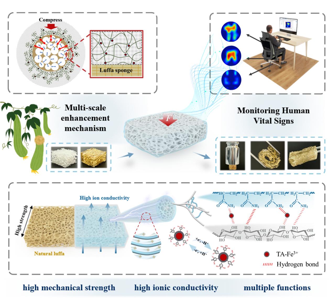 本网讯 近日,公司122cc太阳成集团安徽省健康睡眠家居产品工程中心陈玉霞教授团队在《Advanced Functional Materials》(中科院一区TOP, IF=18.5, 自然指数期刊) 发表生物质基水凝胶柔性传感器相关最新研究论文,题目为“Multifunctional Luffa Sponge Hydrogel with High Mechanical Strength, Fatigue Resistance, and Ionic Conductivity for Monitoring Human Vital Signs”。