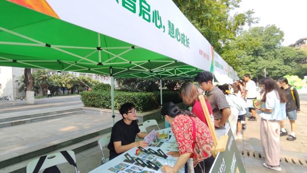 “树木有情,识木辩芯”。在校园树木科普展台,参与者通过观察叶片形态、树干特征学习植物知识,并在自然漫步中记录“心仪树木”的故事,引导同学们在自然中放松身心,感悟生命韧性。