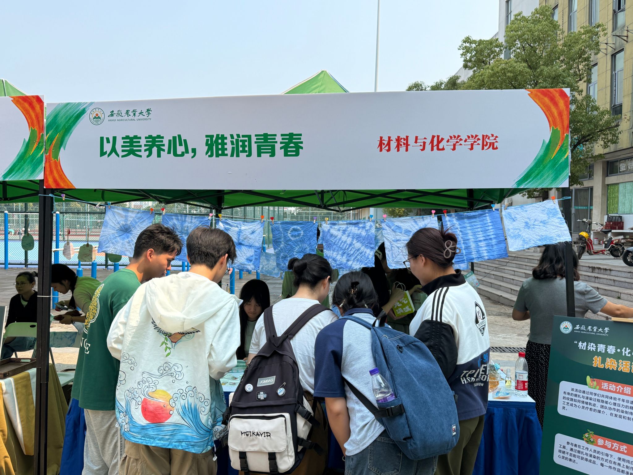 “材染青春,化心工坊”。心理嘉年华扎染展台中,同学们通过亲手捆扎布料、调配染料,体验非遗文化的魅力。活动将艺术创作与心理放松相结合,帮助参与者在色彩与纹理的碰撞中释放压力,感受手工创作带来的成就感。