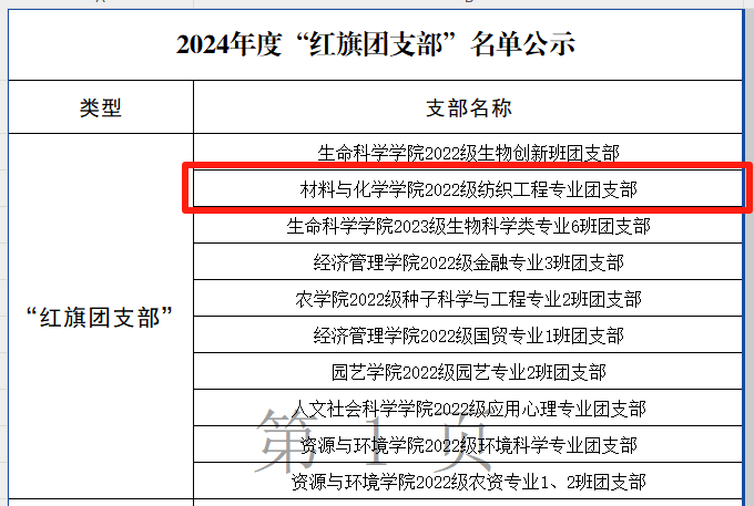 近日,2024年度校级“红旗团支部”评选结果揭晓。经过团支部申请、学院初评、学院推荐的基础上,经公开答辩,全校共有10个团支部获评该项荣誉。公司2022级纺织工程团支部成功斩获2024年度“红旗团支部”称号,彰显了其卓越的整体风貌。该支部曾于2024年10月获评“校十佳班级”,此次再添新荣誉。