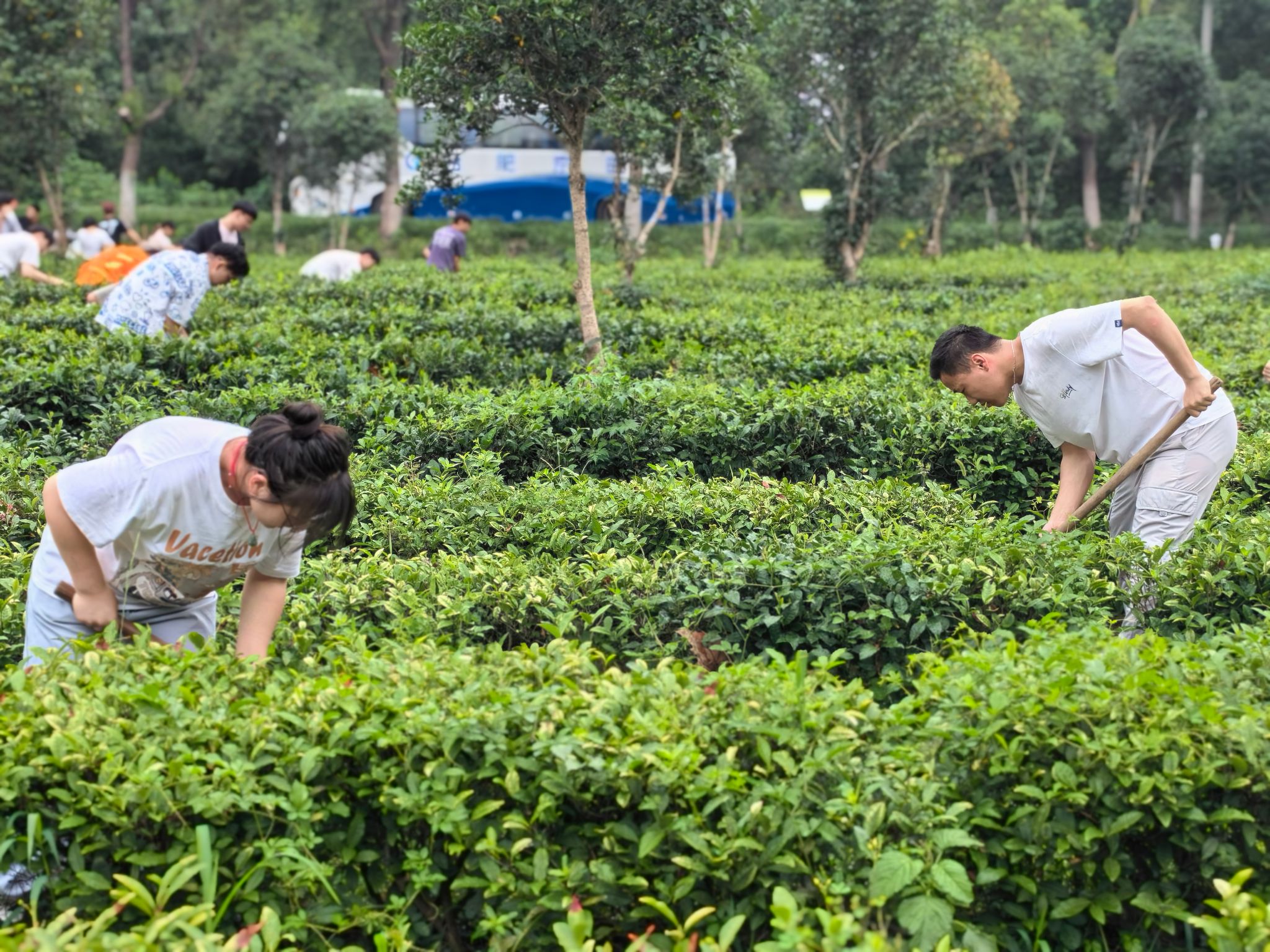 活动开始前,园区的负责老师向同学们介绍了农业园的概况及发展历程、讲解了茶园管理养护技巧以及除草翻地的注意事项。在学习管理养护知识后,在专业老师的指导下同学们分组进入茶园进行实践操作。大家分工协作,在田间地头里干得热火朝天,有模有样。“将实践活动办到大自然里太有意思了,呼吸着新鲜空气,除草、耕地、出出汗特别解压!”22级纺织工程专业的秦光正同学感慨。