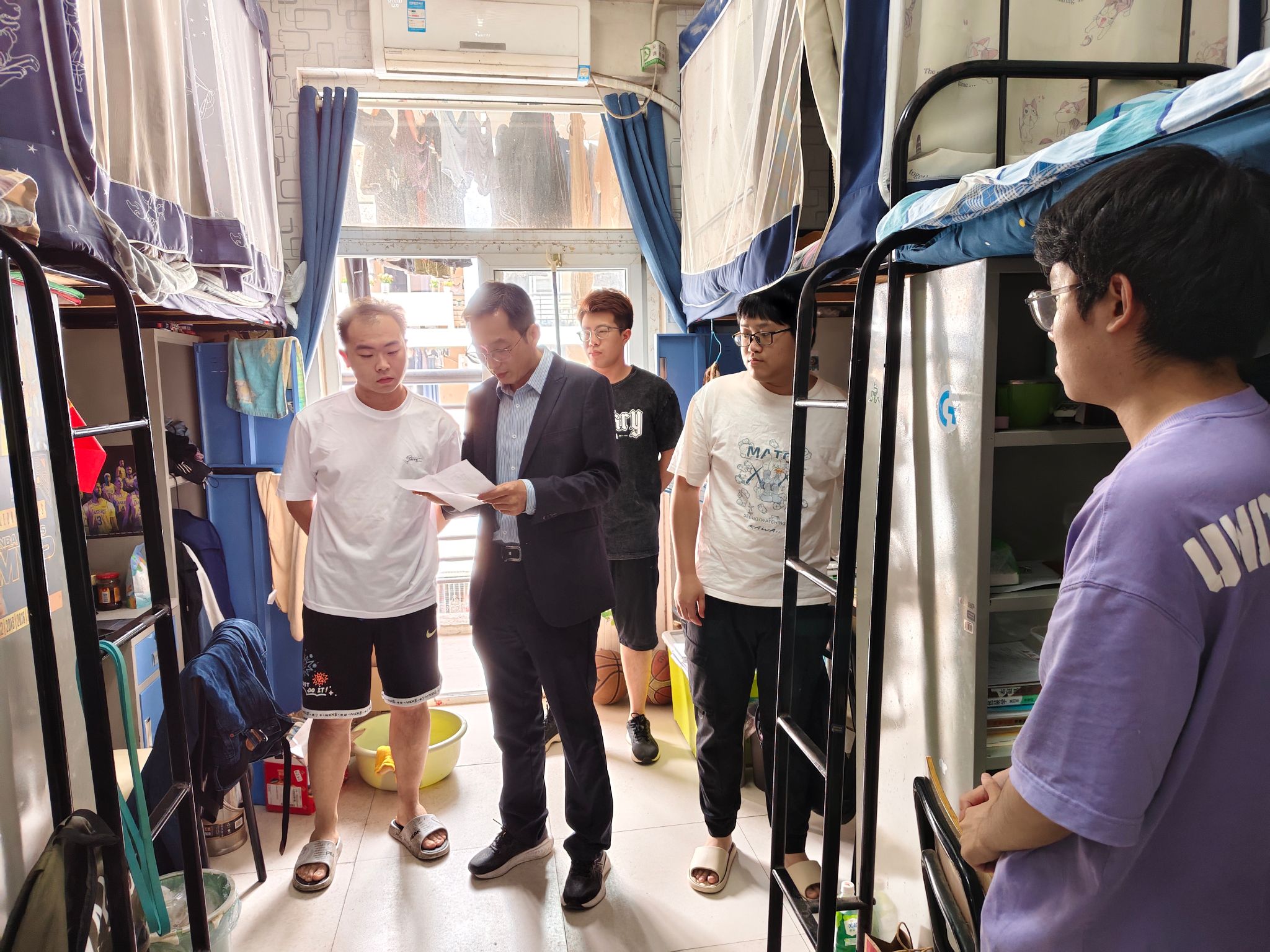 树新风,开展“一次寝室走访”。6月18日,为深入了解毕业生在离校时的所需所求,学院领导班子深入员工宿舍看望慰问毕业生,为即将踏上人生新征途的毕业生送去真切的关怀和温暖的祝福,教育引导员工开展宿舍文明清扫行动,树立毕业生文明离校新风尚。(图/代锐 文/编辑/何俊 预审/张续 审核/周晓娟)